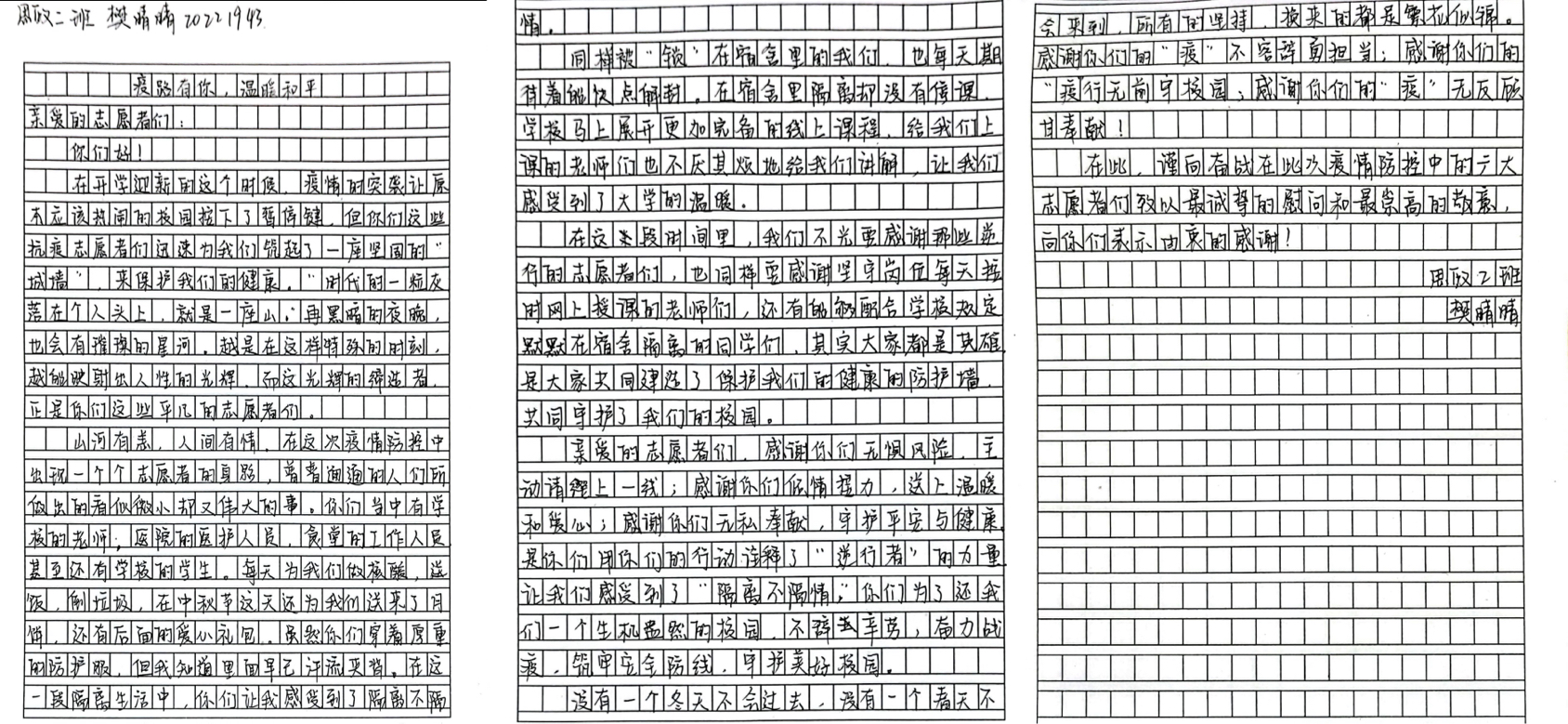 青春灼灼其华,担当历历在目。在此次疫情中,我们的志愿者主动请缨,积极配合医护人员的工作。如今,疫情的圆满结束,十大买球的正规网站于9月28日在线上开展以“疫路有你,温暖相行”为主题的写信活动。