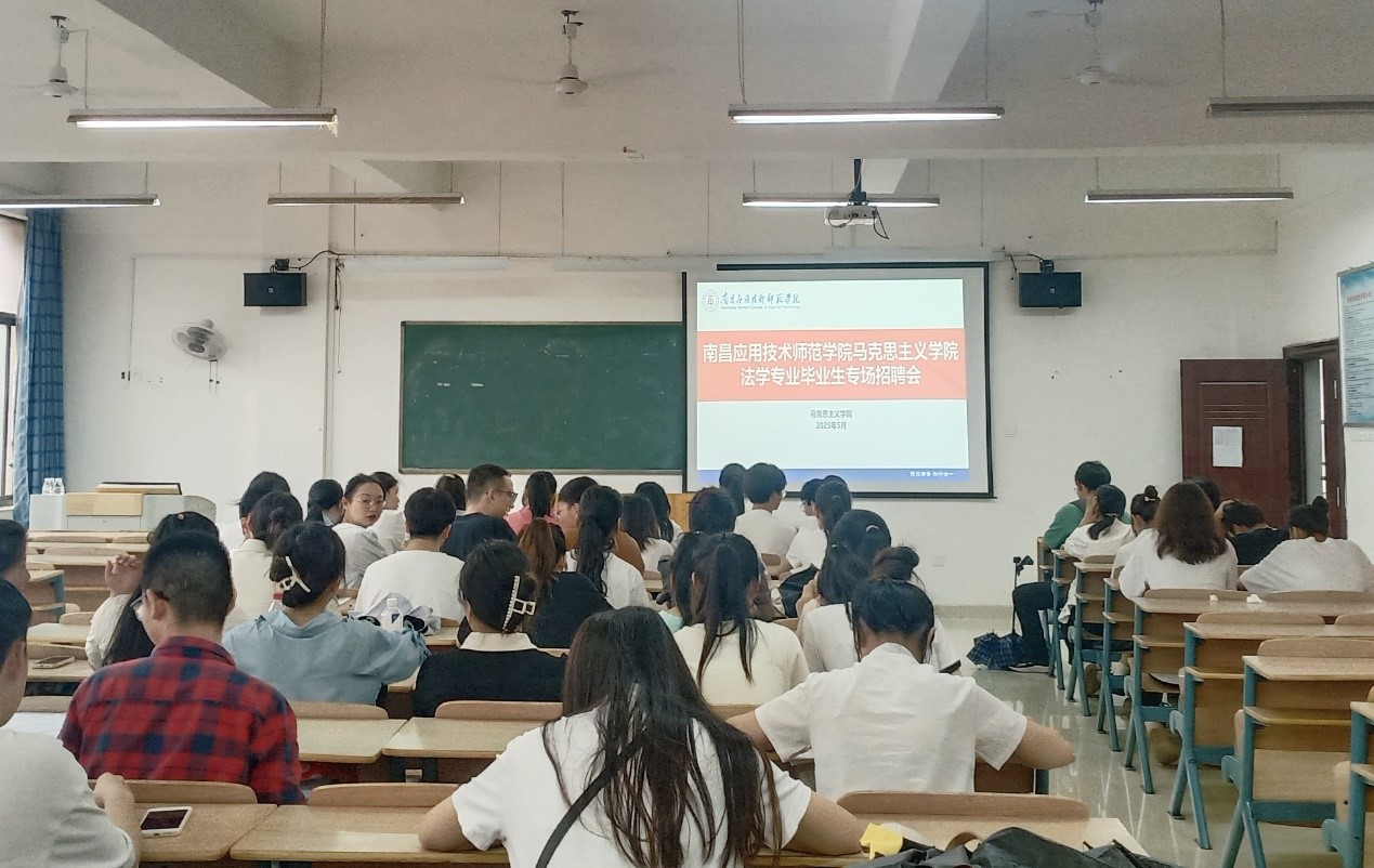 就业是民生之本,是经济发展的基石。为促进买球官网毕业生更好就业,2023年5月17日下午4点半,学院在教学楼3307教室,组织了法学专业毕业生专场招聘会,招聘方为江西鸿韵律师事务所。