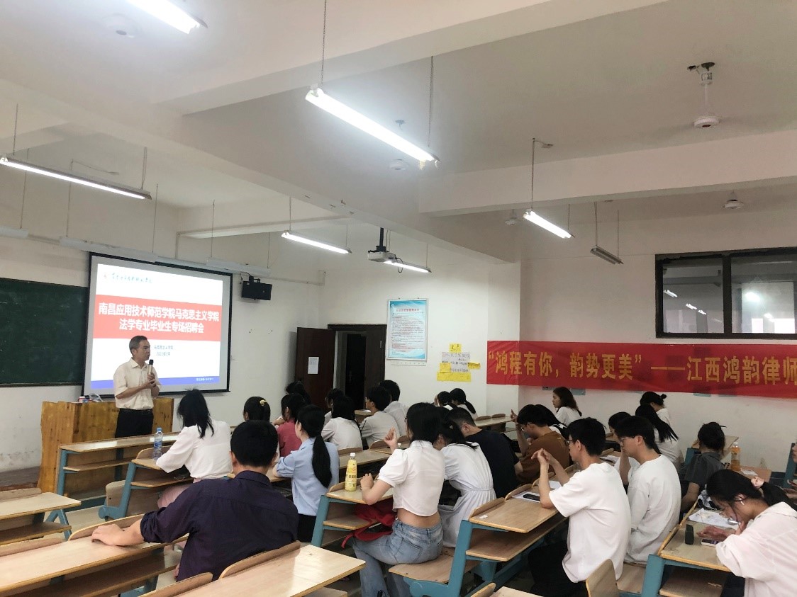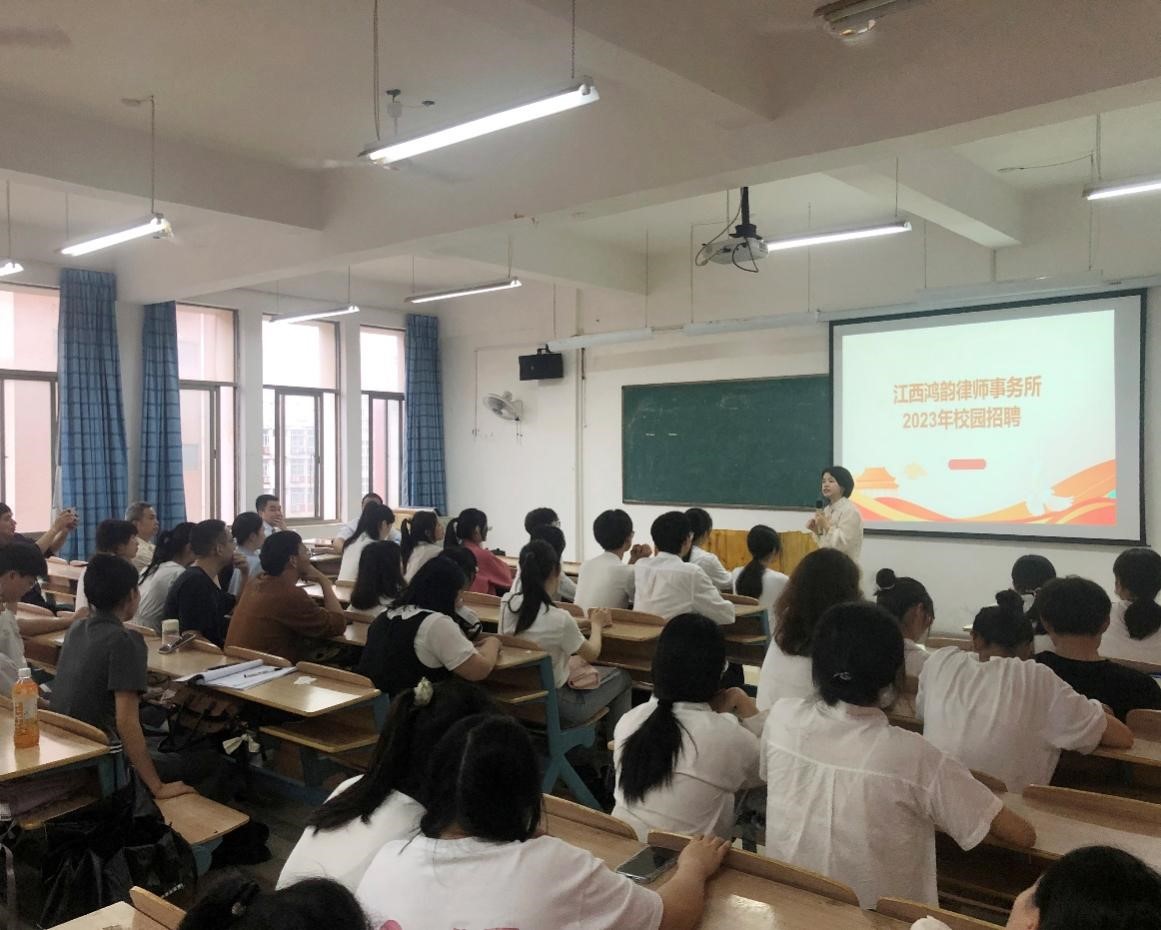 首先由江西鸿韵律师事务所袁小红律师进行宣传,大致讲解了法学毕业生的就业方向,以及就业选择,说到什么样的人适合什么样的岗位,并且鼓励毕业生们积极就业。随后,由江西鸿韵律师事务所施远涛律师进行宣传,讲解了其律所的基本情况,有保障的基本薪资和优厚的绩效酬金,坚强的团队和丰富的案源供给,不设天花板,开放的合伙人制度,其后对招聘人才要求进行解说,并鼓励买球官网法学生毕业生积极向其所投放简历。