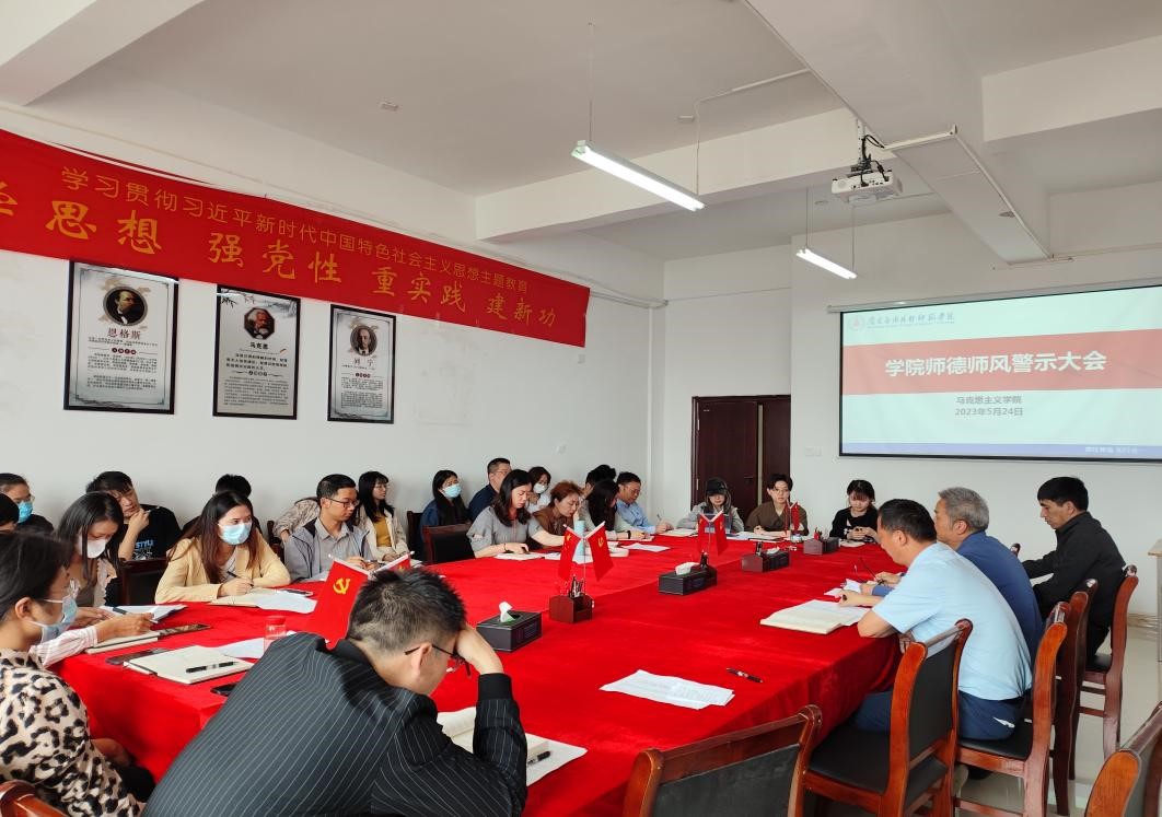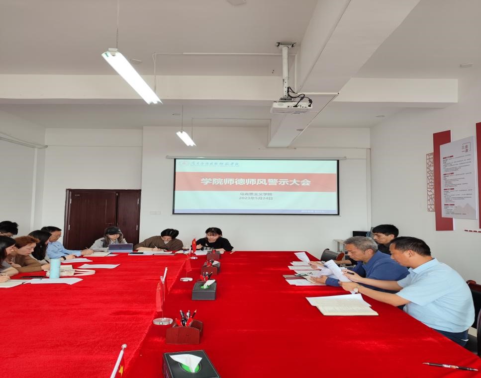 为深入发挥典型案例警示震慑作用,加强师德师风教育,5月24日下午,买球官网在1511会议室召开2023年师德师风警示大会,院长文道贵、副院长卢林保及全体教师参加会议。会议由党总支副书记桂光泽主持。