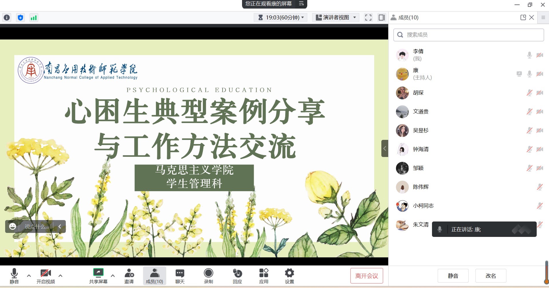 通过参加“心困生典型案例分享与工作方法交流”线上会议,辅导员们认识到:大学生担负着特殊的责任和希望,应该收到更多的关注,而大学生心理健康问题的预防和排解需要多方面的共同努力,一个宽松友好的环境加上大家的群策群力一定能帮助学生有一个健康美好的心理。(图文:李倩 审核:文道贵)