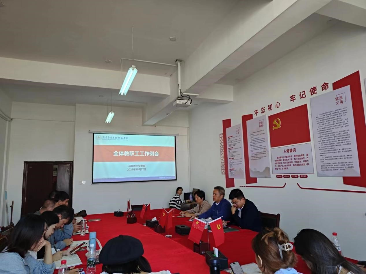 10月17日下午,学院在1511会议室召开全体教职工工作例会,院长文道贵、院党总支书记张欣康、副院长张丹及学院全体教职工参加会议,会议由院长文道贵主持。