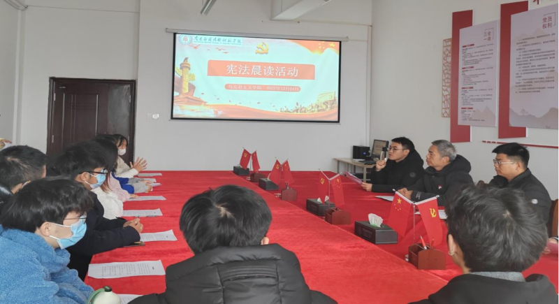 为进一步提高全体师生法律意识,引导学生深入了解宪法、尊崇宪法精神,增强法治观念,推动校园法治文化建设,十大买球的正规网站于2023年12月4日上午9:30在1511会议室组织开展了“宪法晨读”活动,活动由法学教研室主任李水根主持,院长文道贵、党总支书记张欣康、党总支副书记李婷、副院长张丹、法学教研室部分专任老师以及法学班20名学生参加。