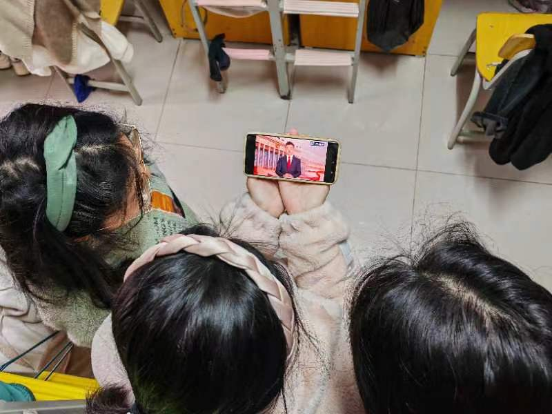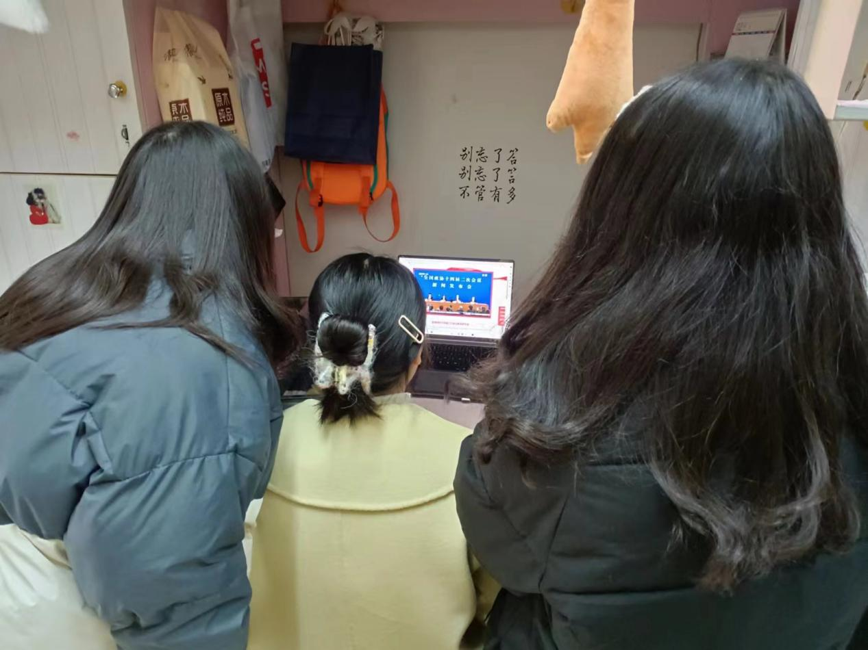 2023级思政3班学生在宿舍集体观看全国两会开幕式,并发表感悟心得。