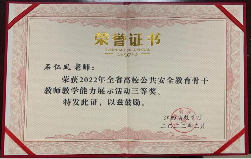 她积极参与省、校两级组织的多项活动,尤其是教学科研课题申报和思政课培训活动,多次参与省级教学类竞赛,积极配合学校宣传工作。截至目前,已多次参加校、市、省三级课题申报,于2022年荣获全省高校公共安全教育骨干教师教学能力展示三等奖。