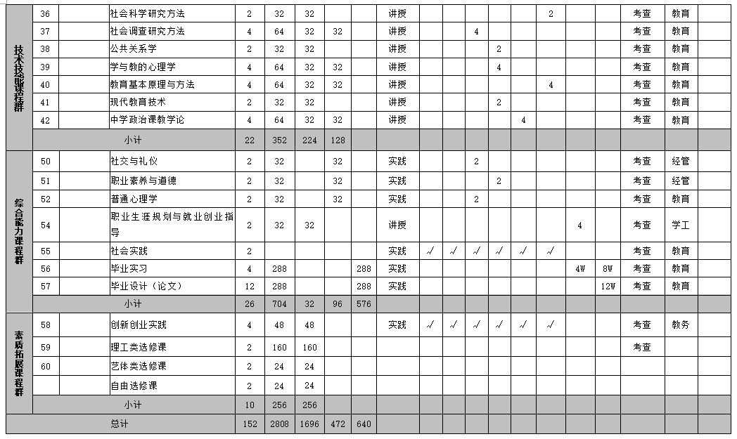 第4-5学期组织安排学生到相应中小学当见习班主任1-2周,工作结束后写一份见习报告,合格者记1个学分;到附近的企事业单位当部门助管,从事相关的思想政治教育管理工作1-2周,熟悉相关工作的流程,见习结束后写一份见习报告,合格者记1个学分。共计2学分。