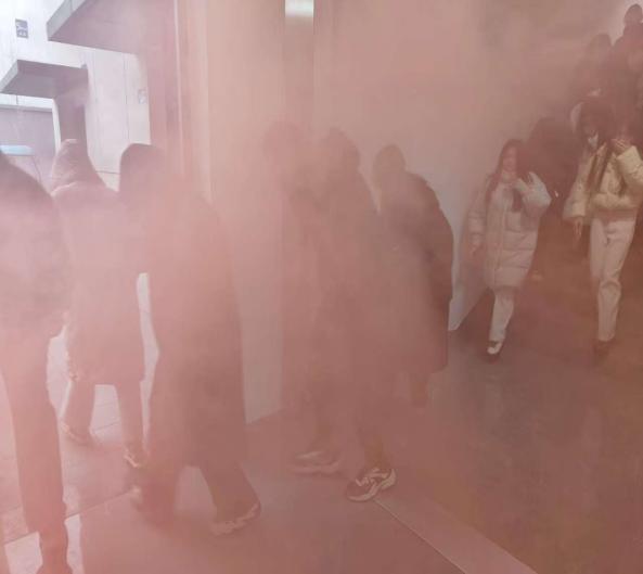 下午2点30分,模拟电器短路起火,烟雾发生器启动,声光报警系统响起。学生们用湿毛巾捂住口鼻,迅速、有序地从楼梯疏散撤离,全程禁用电梯。疏散过程中,楼梯转角处设有观察员控制下行速度,确保不发生拥挤踩踏事故,行动不便的学生也得到了专人帮扶。