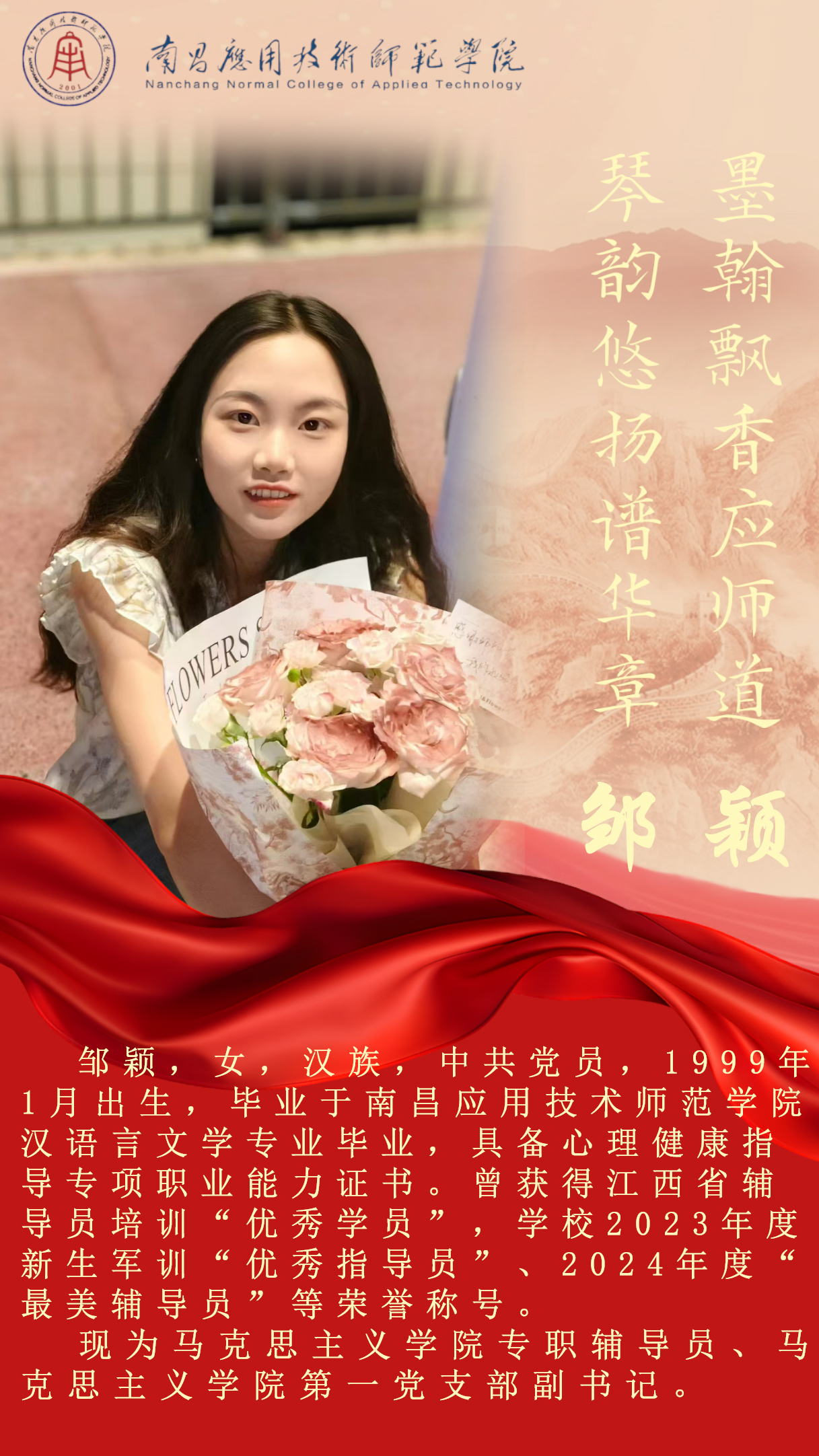 先进典型 优秀毕业生 优秀在校生 优秀教职工 您现在的位置是:首页 > 先进典型 > 优秀教职工 邹颖 最美辅导员 管理员2025-04-172029 上一篇 戴瑞轩 思想政治教育系主任 下一篇 李宏鑫 先进工作者