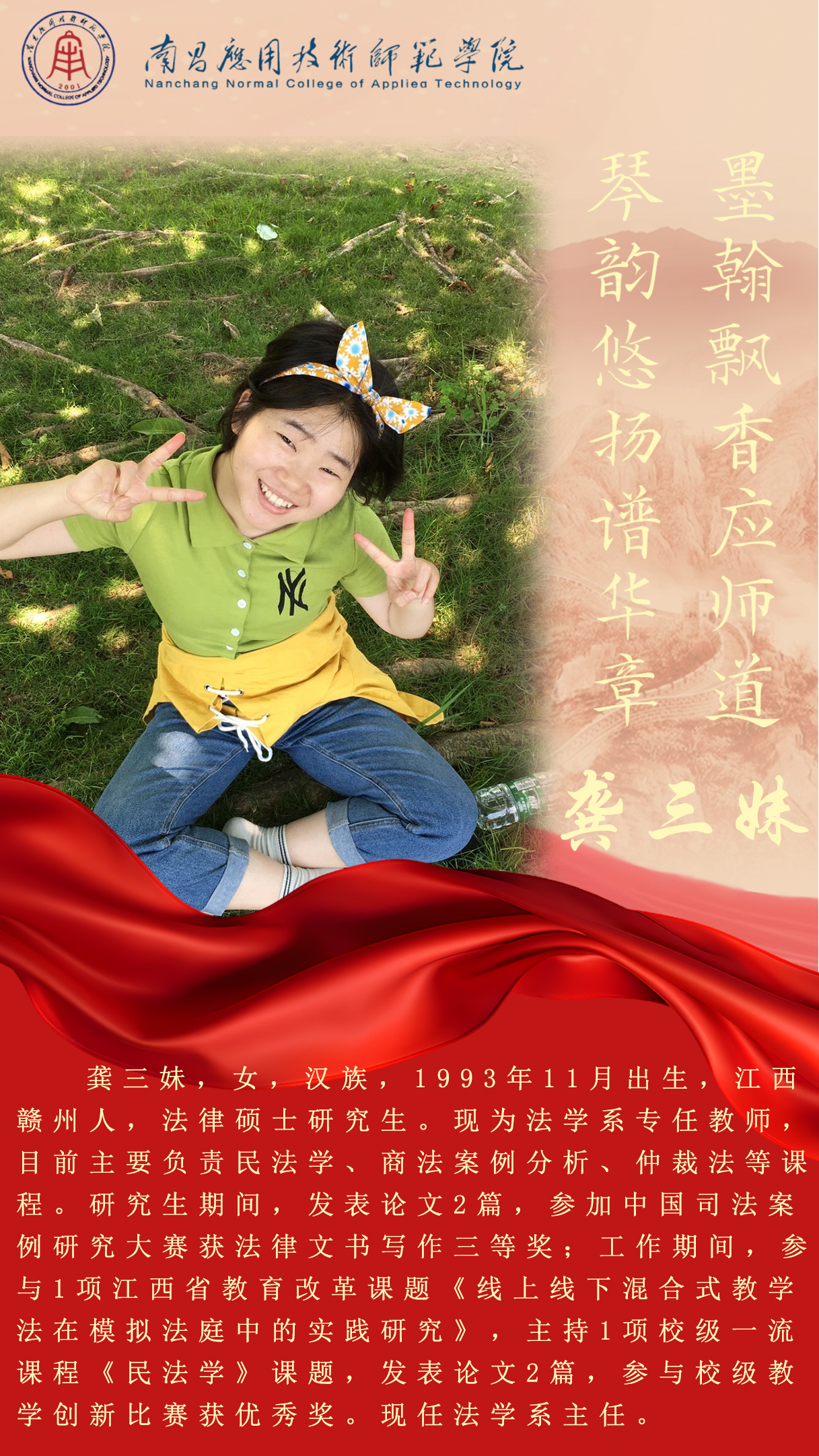 先进典型 优秀毕业生 优秀在校生 优秀教职工 您现在的位置是:首页 > 先进典型 > 优秀教职工 龚三妹 法学系主任 管理员2025-06-091927 上一篇 李婷 思想政治教育公共课系主任 下一篇 戴瑞轩 思想政治教育系主任