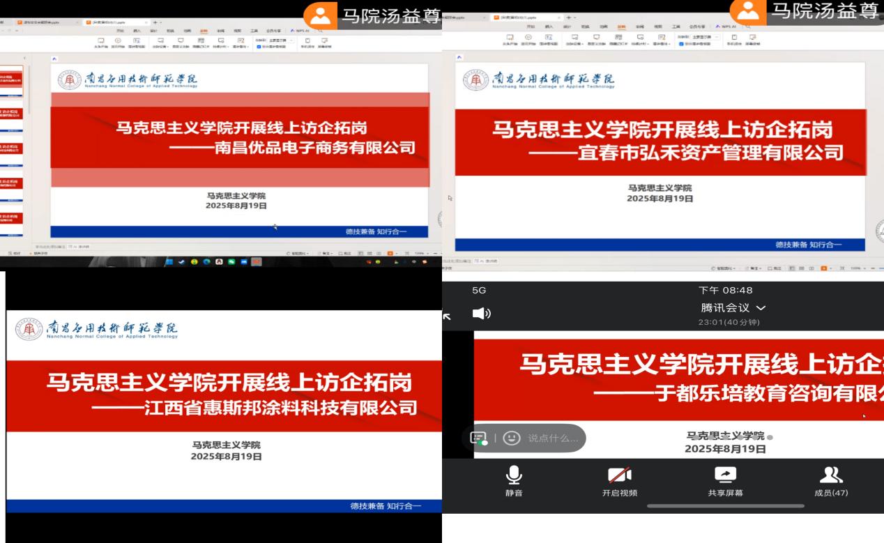 为进一步拓宽毕业生就业渠道,加强校企合作,促进学生高质量就业,十大买球的正规网站于2025年8月19通过视频会议的方式与南昌优品电子商务有限公司、宜春市弘禾资产管理有限公司、江西省惠斯邦涂料科技有限公司、于都乐培教育咨询有限公司开展了线上访企拓岗活动。