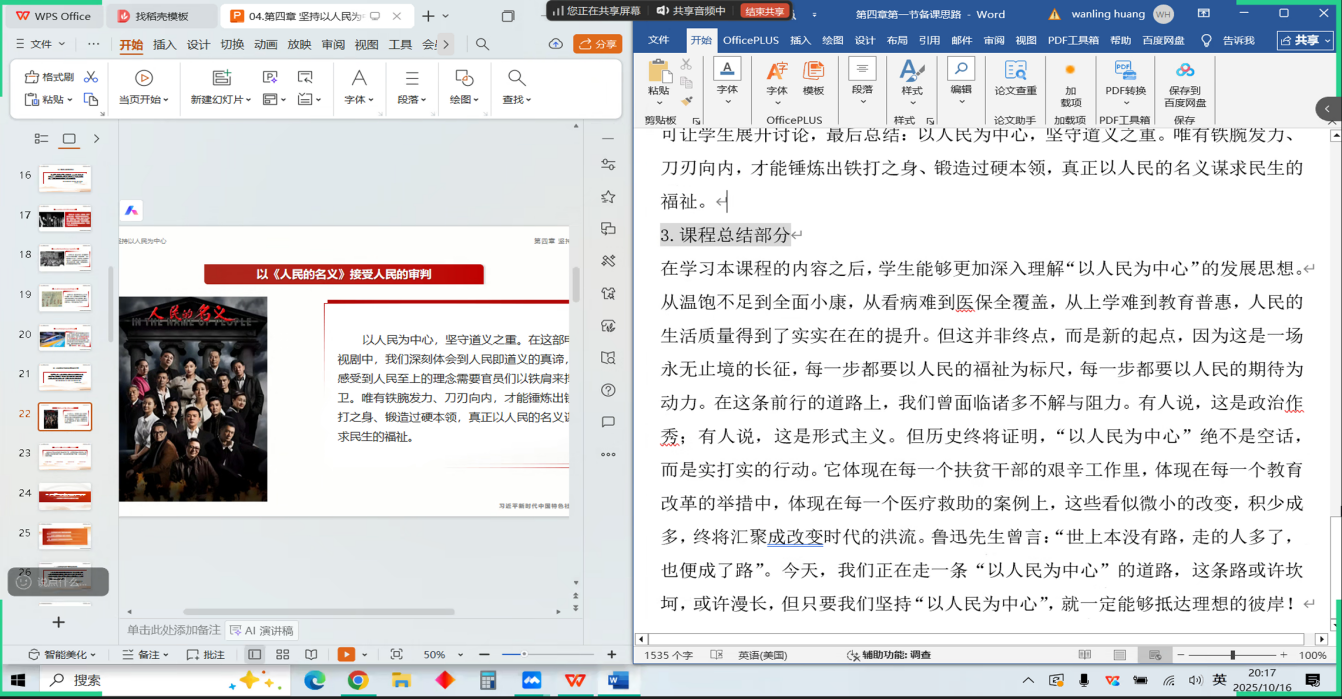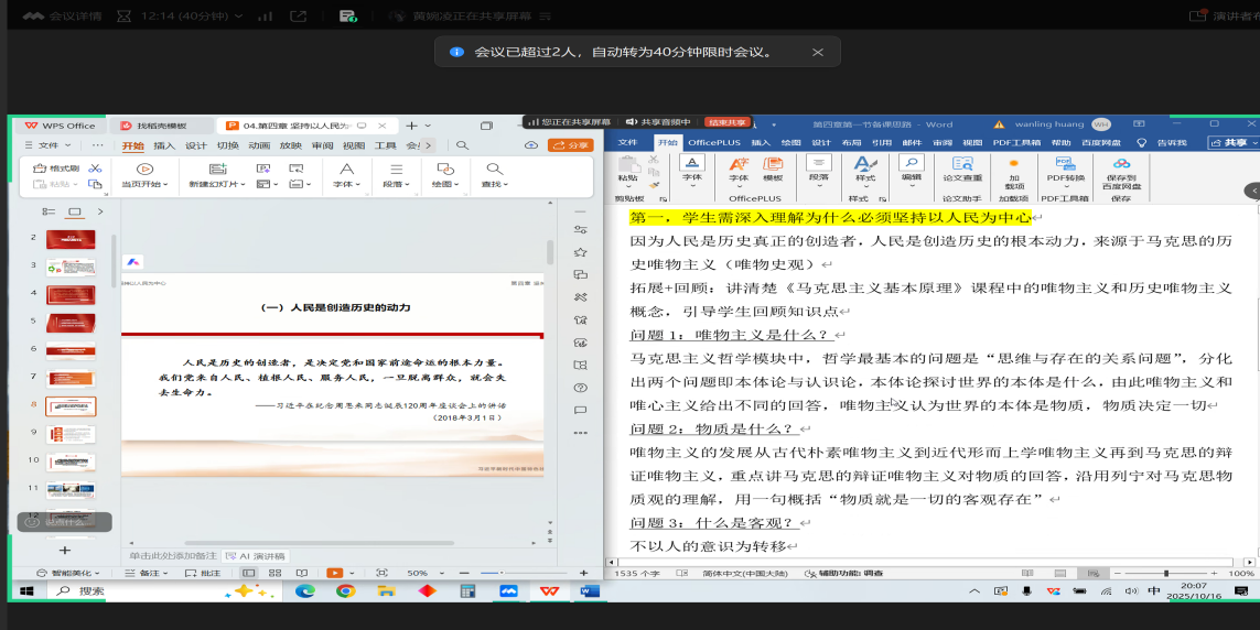首先,会议进行示范课教学分享。黄婉凌老师围绕“为什么必须坚持以人民为中心”专题进行教学设计,课程导入环节,黄老师以爱德曼信任度晴雨表数据为切入点,构建了“为何坚持—为了人民”、“依靠谁—依靠人民”、“由谁评判—评判由人民”的三大理论框架,逻辑严谨,层层递进。在教学方法上,课程有机融入了“携手为人民”短视频、《人民的名义》剧集案例等多媒体素材,实现了理论讲授与情感共鸣的有机结合,获得了与会教师的高度认可,被认为是一堂具有强逻辑性与感染力的高质量示范课。