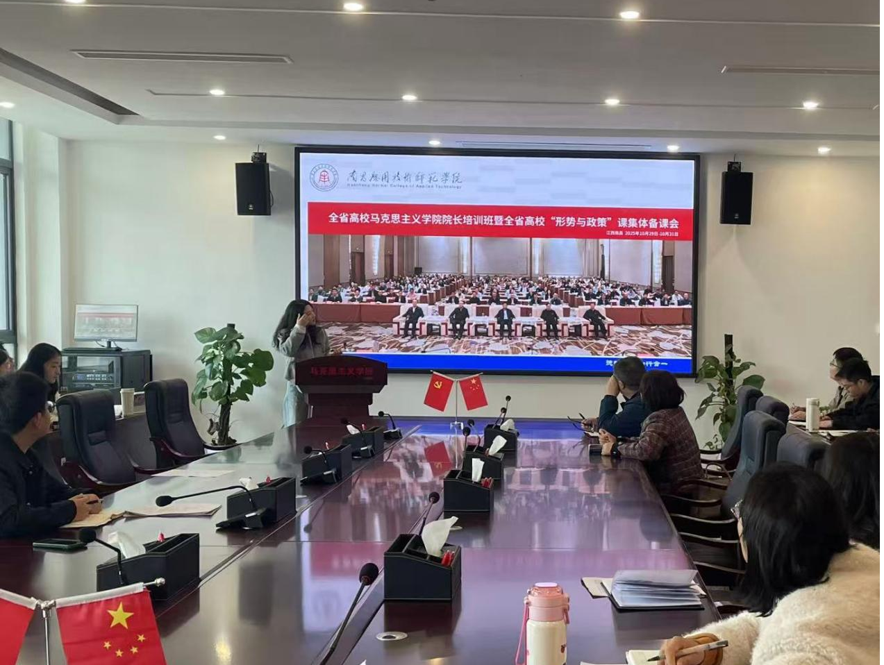 随后,思政教师李维就10月30-31日在南昌举行的江西省高校十大买球的正规网站院长培训班暨全省高校“形势与政策”课集体备课会作专题分享。她传达了备课会上《国内经济形势及十五五规划解读》《携手周边国家共创美好未来,推动构建新形势下国际关系》《解读二十届四中全会精神》三个讲座重点内容,并对部分高校“形势与政策”课开课情况及课程未来发展进行了分享。全体与会人员共同观看学习了集体备课会上第四届全国高校思政课教学展示活动形策课参赛选手的现场教学展示视频。