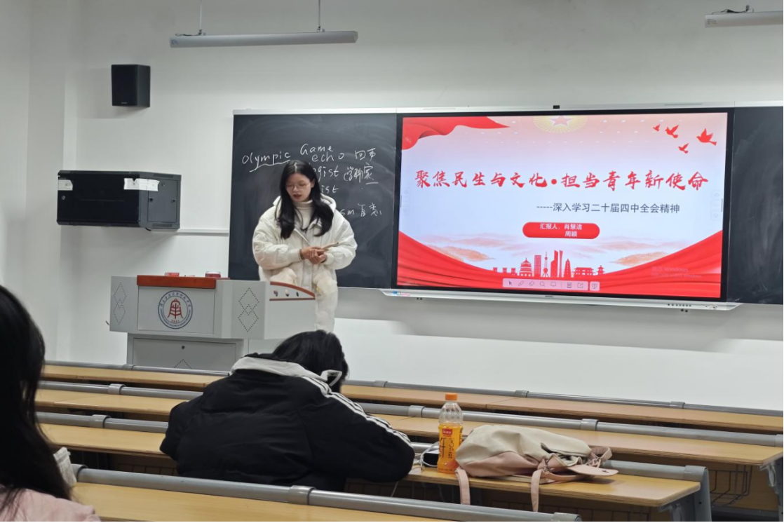 为深入学习宣传贯彻党的二十届四中全会精神,引导青年学子精准把握时代脉搏、明晰青年使命担当,11月24日,星火宣讲团走进2025级思政班级,开展以“聚焦民生与文化,担当青年新使命”为主题的全会精神宣讲活动,以青年视角传递理论温度,以鲜活表达凝聚青春力量。