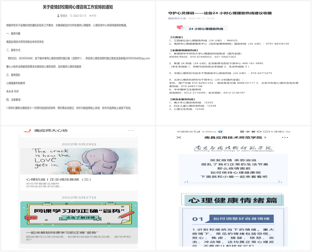 疫情爆发以来,我校心理健康教育与咨询中心第一时间面向学生公布QQ、邮箱等预约咨询方式,为学生提供及时有效的一对一心理支持与服务,做好心理“云”咨询服务,并拓展校外咨询渠道,引进江西省社会24小时心理服务热线,“心护航”抗疫公益心理援助热线(24小时开放),中国心理危机与自杀干预中心救助热线等,在关心呵护和暖心帮扶中为学生提供心理支持,有效地缓解了疫情给学生带来的压力与困扰。与此同时,我校利用微信公众号平台积极主动为学生提供各类心理自助资源,例如疫情期间心理健康应对手册,正念减压音频、心理科普视频及文章等。