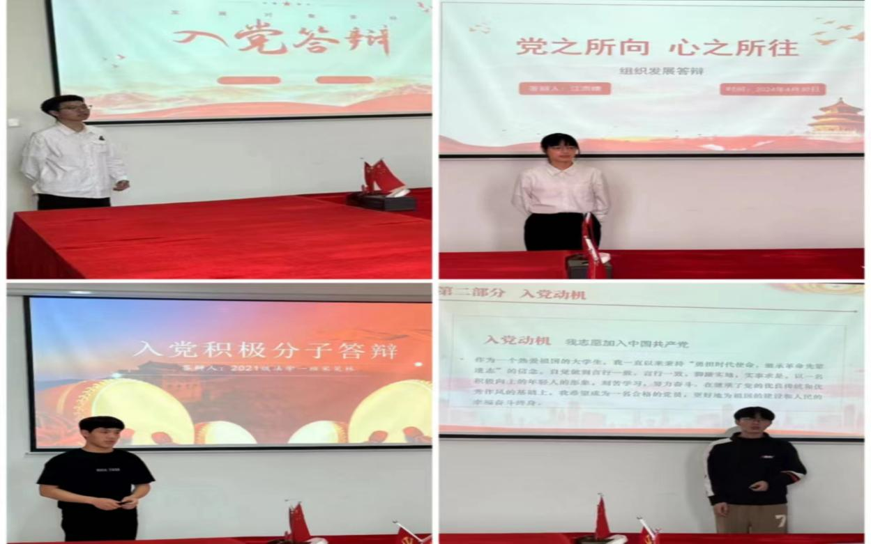此次答辩共有两个环节,分别为个人陈述和现场问答。8位候选人按照抽签顺序逐一进入答辩会场,从思想、学习、工作等方面进行了重点阐述。陈述环节后,评委老师们围绕党的基本理论知识、党史党章、《中国共产党纪律处分条例》等方面进行提问,入党积极分子结合自身情况进行回答。